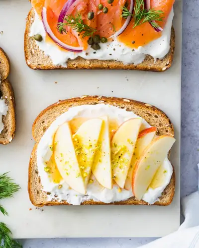 Tu je geniálny recept na jablkové raňajky, ktorý chutí oveľa lepšie ako súčet jeho častí: Toast s jablkovou a medovou ricottou! Na toast natrieme syr ricotta, potom naň naložíme nakrájané jablká, pokvapkáme medom a škoricou. je to také jednoduché a tak uspokojujúce!