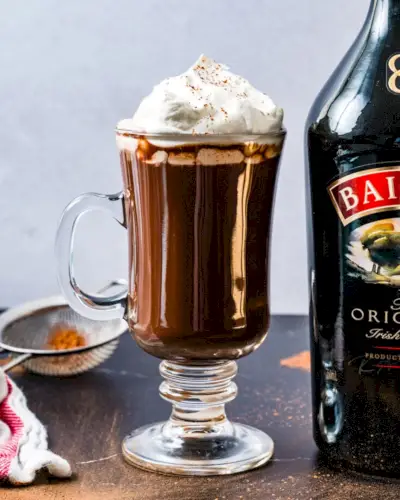láska Baileys ? Potom je tu hrejivý kokteil, ktorý si zaradíte do zoznamu nápojov: Baileys Hot Chocolate! Má najlepšiu hlbokú čokoládovú chuť, zvýraznenú čokoládovými a vanilkovými tónmi s ovocným záverom írskej whiskey. Doplnené nadýchanou šľahačkou je to zjavenie! Podávajte túto sladkosť teplý alkoholický nápoj kedykoľvek budete potrebovať zimné vyzdvihnutie: alebo je to skvelé pre sviatky alebo snehový deň.