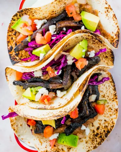 Tu je rýchly a jednoduchý recept na huby portobello ideálny na víkendy: vyskúšajte tieto hubové tacos! Portobello huby majú enormnú pikantnú chuť: hodíte ich na panvicu s štipľavým korením a vyčarujú rastlinnú mágiu. Tento recept je pre vás, keď máte len pár minút na prípravu jedla: skombinujte tieto portobellos so smotanovou fazuľou a najrýchlejšou kapustou a máte večeru!