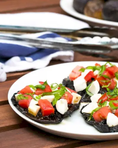 Ďalší skvelý recept na hubu portobello? Grilujte ich a naplňte ich sviežou letnou polevou! Tieto grilované šampiňóny sú pikantné a údené, posypané tou v štýle caprese z čerstvej mozzarelly, paradajok a bazalky. Sú skvelé pre kuchára: alebo si ich upečte kedykoľvek podľa pokynov v recepte na plnené portobellos vyššie.
