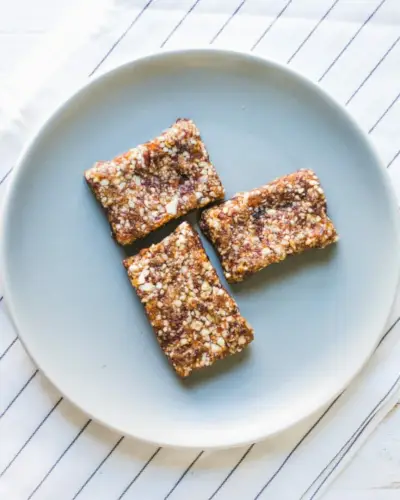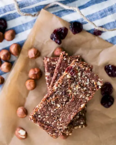 Tieto zdravé vegánske energetické tyčinky sú podobné domácim Larabarom, ale s trochou väčšej textúry. Rovnako ako surové sušienky , sú bezlepkové a úplne prírodné, vyrobené hlavne z datlí a orechov Medjool. Táto verzia používa lieskové orechy pre komplexnejšiu chuť a sušené čerešne pre pikantnú poznámku, ktorá dopĺňa sladkosť.