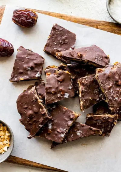Datlová kôra je ako čokoládová kôra, ale na báze datlí Medjool! Tento vírusový recept TikTok kombinuje datle s arašidovým maslom, čokoládou a arašidmi. Chutí ako tyčinka Snickers a je to perfektná vegánska a bezlepková pochúťka, ktorú môžete mať v mrazničke!