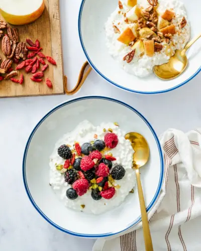 Tento nápad na stredomorskú diétu je prekvapivo uspokojivý! Vrchný vysokoproteínový tvaroh s čerstvým ovocím alebo jablkom, škoricou a pokvapkaným medom. Alebo navrch pridajte pikantné polevy ako údený losos alebo cícer a paradajky.