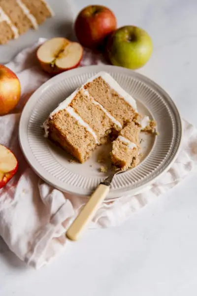 Tento jablkový dezert vyniká pikantnou chuťou jablčného muštu! Je to dokonale vlhký a jemný jesenný koláč ochutený korením, pokrytý krémovou javorovou hnedou maslovou polevou. cez Grandbaby Cakes