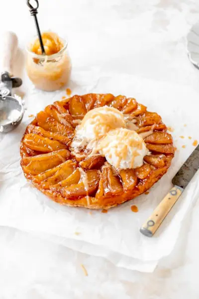 Tarte tatin je francúzsky koláč hore nohami a je to fantastický jablkový dezert. Tento obsahuje pomaly varené, karamelizované jablká, ktoré sa pečú do vločkového maslového oblátku a potom sa prelejú likérovou smotanovou omáčkou Baileys Apple Pie. cez Grandbaby Cakes