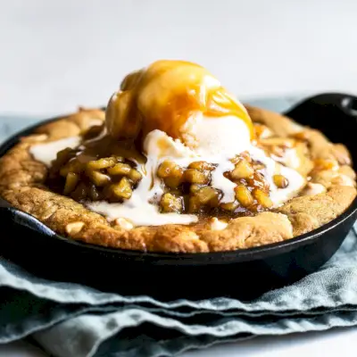 Pizookie je kombinácia medzi pizzou a koláčikom: niečo ako koláčik na panvici! Toto je absolútna jablková dekadancia. Je to pizza sušienka s kúskami bielej čokolády s náplňou z čerstvého karamelového jablkového koláča, zmrzlinou a ďalším karamelom. cez Handle the Heat