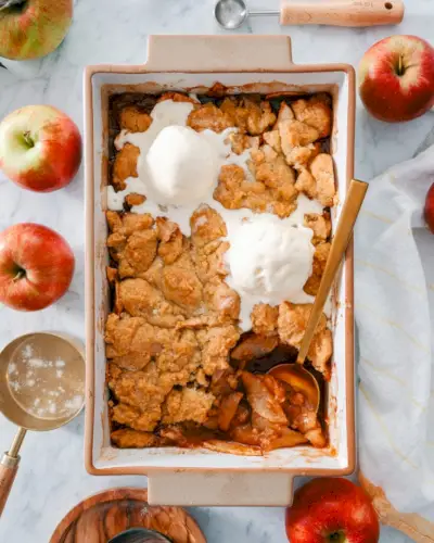 Tu je útulňa pečené dobre to volá tvoje meno: tento jednoduchý recept na jablkový buchtík! Poleva je zmes sušienky a cukrovej sušienky, žuvacia, sladká a pečená do zlatohnedých kociek. Pokrýva sladko okorenenú jablkovú vrstvu, ktorá je ochutená škoricou, zázvorom, muškátovým orieškom a citrónovou kôrou na trochu pop. Doplňte ju roztopenou vanilkovou zmrzlinou a v jablkovom dezerte už naozaj nechceme nič viac.