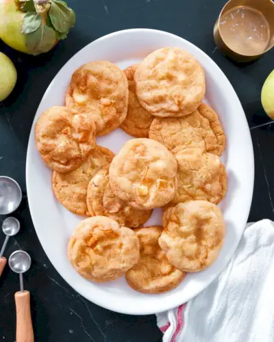 Tieto jablkové snickerdoodle sú neodolateľne jemné, so sladkou vrstvou škorice a cukru. Každé sústo obsahuje dávku sladkého jablka! Nezaberú čas na šľahanie a nevyžadujú žiadne chladenie cesta pred pečením: čo znamená, že si čo najskôr môžete zaboriť zuby do tohto mäkkého, koreneného koláčika.