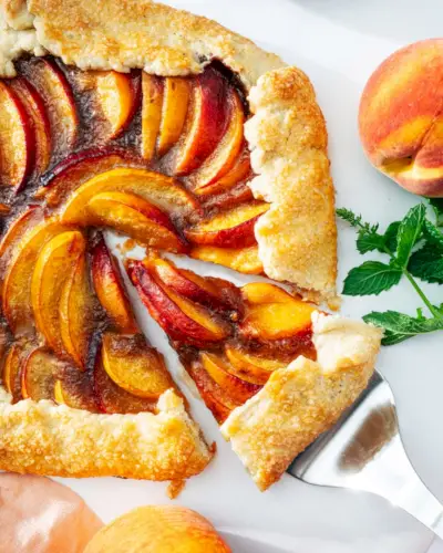Tu je konečná letná pochúťka: broskyňová galette! Predstavte si plnku z jemného ovocia ochuteného hnedým cukrom, orieškovým maslom a štipkou škorice a vanilky. To všetko je zabalené v šupinovej, maslovej kôrke pečiva.