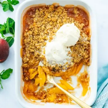 Tento nostalgický broskyňový dezert je čistou letnou blaženosťou. Zrelé, šťavnaté broskyne sú hviezdou v mazľavej náplni s vanilkovou vôňou, ktorá je pokrytá správnym pomerom chrumkavých zlatých drobkov. Navrch dajte kopček roztopenej vanilkovej zmrzliny a je to letné dezertné nebo!