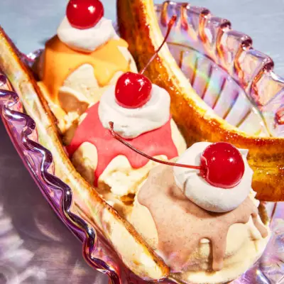 Klasická čerešňa alebo koliesko čerstvého ovocia umocní príťažlivosť pohára. Brûléed Banana posúva našu banánovú porciu na ďalšiu úroveň a dodáva nostalgickej pochúťke horkosladký karamelizovaný rozmer. V našom Coconut-Mango Kataifi Sundae hrajú plátky čerstvého manga a pražené kokosové lupienky proti trojici príchutí tropickej zmrzliny.