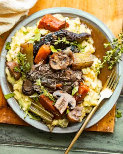 Toto kučeravé pečené v rúre je jednoduchou a upokojujúcou vianočnou večerou! Šťavnaté vidličkou jemné hovädzie mäso je dusené na červenom víne s mrkvou, zelerom, cibuľou, cesnakom a čerstvými bylinkami pre lahodné klasické jedlo. (Bezlepkové) cez Britney láme chlieb
