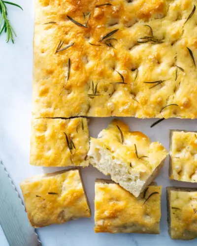 Tento domáci chlieb focaccia je nápadný a ideálny na Vianoce! Je hustá a vzdušná, zvonka chrumkavá s krásnymi vankúšovými vzduchovými vreckami vo vnútri. Chuť je vyvinutá a dokonale okorenená, s klasickými tónmi soli, rozmarínu a olivového oleja.