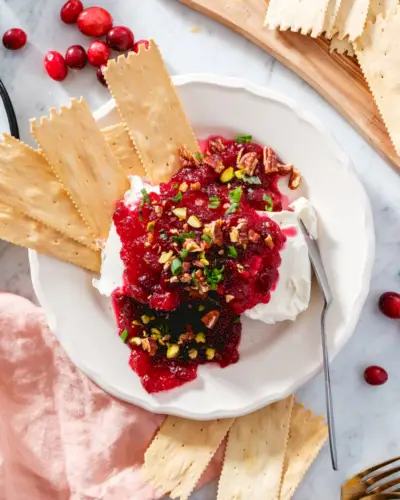 Potrebujete jednoduché vianočné predjedlo? Vyskúšajte tento jednoduchý brusnicový krémový syrový dip! The domáca omáčka plné sladkých a štipľavých brusníc, pomarančového džúsu a ak chcete, trochu jalapeňo na chuť. Nalejte ho na smotanový syr a je ideálny na namáčanie sušienok alebo dokonca plátkov jabĺk. Dá sa dokopy za pár minút s minimálnym úsilím.