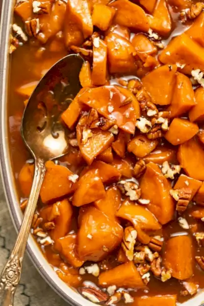 Tieto staromódne kandizované sladké zemiaky sú klasickým jedlom pre dušu. Roztopené batáty sa pečú v maslovej hnedej cukrovej poleve s teplým korením a vanilkou. Vynikajúce! cez Britney láme chlieb