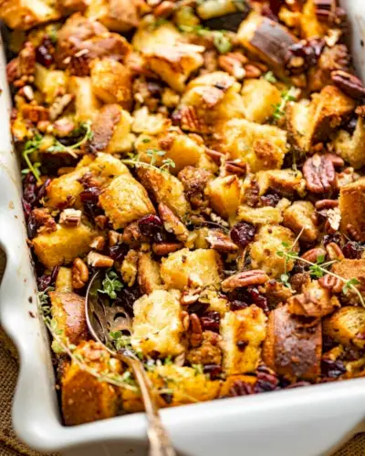 Tento recept na plnku z kysnutého cesta je domáca plnka plná chuti, ktorá je ideálna na vianočnú večeru! Je vyrobený z klobásy, čerstvých byliniek a doplnený pekanovými orechmi a sušenými brusnicami pre sladkú a slanú chuť. cez Britney láme chlieb