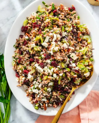 Táto zmes ryže s chrumkavou zeleninou, pekanovými orechmi, brusnicami a syrom feta je ideálna na sviatky. Dresing z javorového dijonského vinaigrette má štipľavú chuť prerušenú návalmi čerstvej petržlenovej vňate.