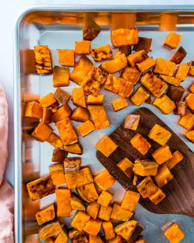 Vyskúšajte tieto sladké zemiaky pečené v rúre, ktoré sa dajú na vianočnú večeru spárovať takmer s čímkoľvek! Nakrájajte ich na kocky, opatrne ochuťte a opečte, kým nezhnednú a skaramelizujú na vonkajšej strane.