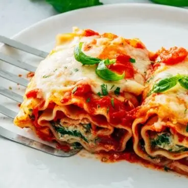 Zábavný nápad na vianočnú večeru: zvýraznite žiarivú červenú a zelenú v týchto rolkách lasagne! Omotajte rezance okolo plnky a vytvorte chutný a zábavný recept na večeru. Tento recept obsahuje plnku zo špenátu, bazalky a ricotty, preliatu cesnakovou jednoduchou domácou paradajkovou omáčkou. (Vegetariánska, bezlepková s GF rezancami)