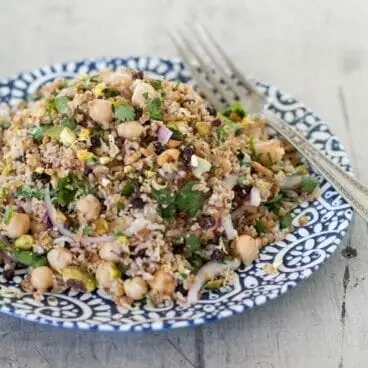 Tento šalát z cíceru a bulguru je pikantný a svieži, obsahuje čerstvé koriander a petržlenovú vňať, cícer, pšenicu bulgur, ríbezle a citrón.