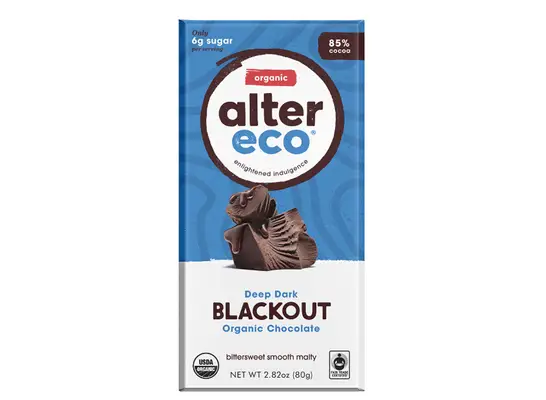 Ďalšou tyčou z tmavej čokolády, ktorá je veľmi vysoká koncentrácia kakaa, je alter eko -tmavom tmavom výpadku, s 85 % kakaom a iba 6 gramami čistých sacharidov.