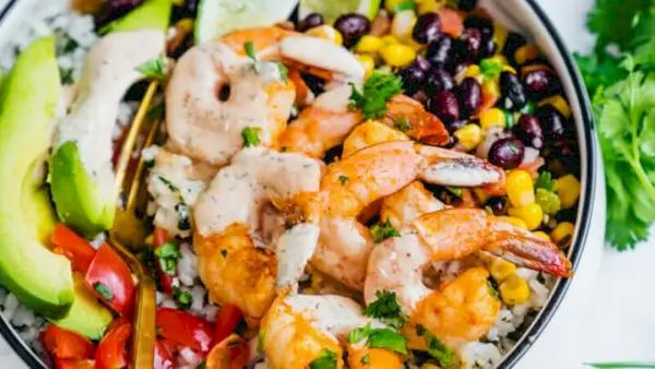 - Urobte a Miska na krevety s koriandrovou limetkovou ryžou , Mexikom inšpirovaná rotácia na miske burrito
