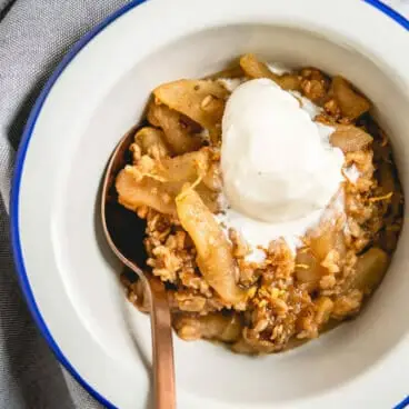 - Nezabudnite ozdobiť! Posypanie citrónovou kôrou zmiešané so škoricou rozžiari tmavšie chute chrumkavých. Potom podávajte s vanilkovou zmrzlinou, vegánskou škoricovou zmrzlinou alebo kokosová šľahačka . ( Bourbonová šľahačka tiež by bolo pekné!)