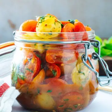 Marinované paradajky sú skvelý spôsob, ako využiť túto šťavnatú sezónnu plodinu! Chuť zvýšte olivovým olejom, balzamikom, cesnakom a bylinkami.