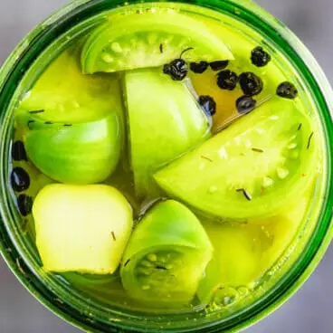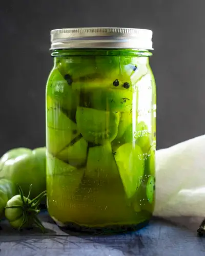 Tieto nakladané zelené paradajky sú rýchle nakladané uhorky, akákoľvek zmes zeleniny, ktorá bola nakladaná v zmesi octu, soli, cukru a vody a skladuje sa v chladničke. Veľká časť o nich? Nie je potrebné žiadne konzervovanie! Nie je potrebné žiadne špeciálne zariadenie na konzervovanie, vďaka čomu je celý proces rýchly a jednoduchý.