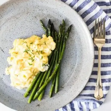 Toto je vaša epická nátierka na neskoré raňajky, takže podávajte tieto miešané vajíčka, ako sa vám páči! Ale ak potrebujete nejaké tipy, Alex a ja milujeme posypanie nasekanou pažítkou na vrch týchto vajec. Pažítka dodáva mazľavým vajíčkam jemný výbuch sviežosti bez toho, aby prebila jedlo. Tieto vajíčka si môžete vychutnať aj s plátkom kvalitného toastu alebo si pochutnať na párovaní špargle a vajec. Ak má špargľa vo vašej oblasti sezónu, skúste ju kúpiť na farmárskom trhu.