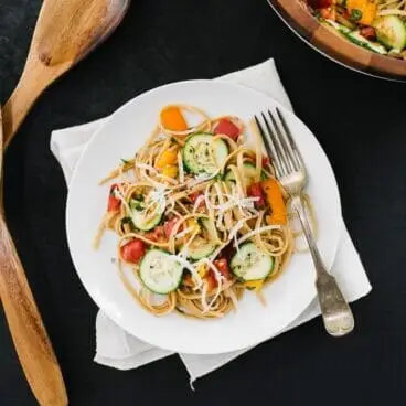 Tieto cestoviny s cuketou boli druhým receptom, ktorý sme kedy zverejnili na tomto blogu v auguste 2010. Paradajky sme si nazbierali z miestnej farmy a boli dokonale zrelé. Chuť bola letná v miske. Napísal som príspevok o tom, aké to boli najlepšie cestoviny vôbec. Pred pár týždňami som náhodou na Pintereste natrafila na fotku a spomenula som si, ako sa nám recept páčil. Rozhodli sme sa oživiť tento z archívov kvôli starým časom.