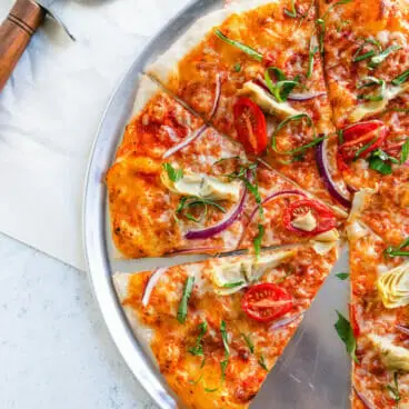 Čo je lepšie ako talianska pizza v remeselnom štýle? Ako možno viete, sme tu tak trochu posadnutí pizzou. Alex a ja sme strávili roky hľadaním najlepšieho spôsobu, ako si doma vyrobiť remeselnú pizzu, vrátane niekoľkých výletov do Talianska. Vytvorili sme naše recept na najlepšie pizzové cesto , náš vážne dobrý ľahká pizza omáčka , a náš najlepšia pizza Margherita . Ale za 10 rokov výskumu sme nevyrobili skutočný recept na pizzu s tenkou kôrkou...až doteraz. Sme nadšení, že vám môžeme predstaviť tento jednoduchý recept na cesto na pizzu!